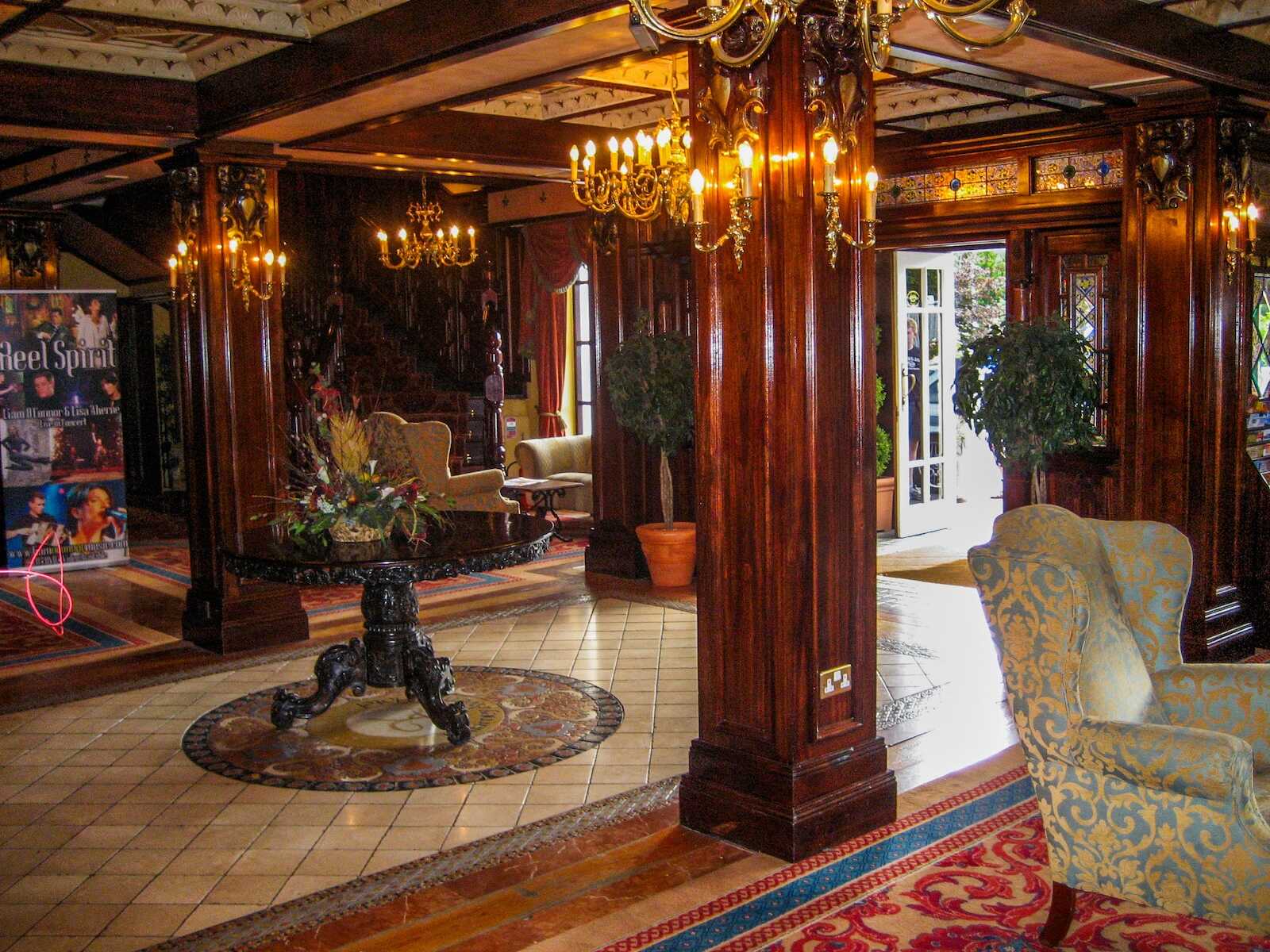 The Killarney Avenue Hotel is a charming four-star hotel located in the heart of Killarney, offering elegance and traditional Irish hospitality. Overlooking the picturesque Killarney National Park, this hotel is ideally situated for travelers wanting to explore the natural beauty of County Kerry, while still enjoying the convenience of being close to the town’s vibrant shops, pubs, and restaurants. Scroll down to see our photos of the old-world wooden carved interiors inside the hotel.