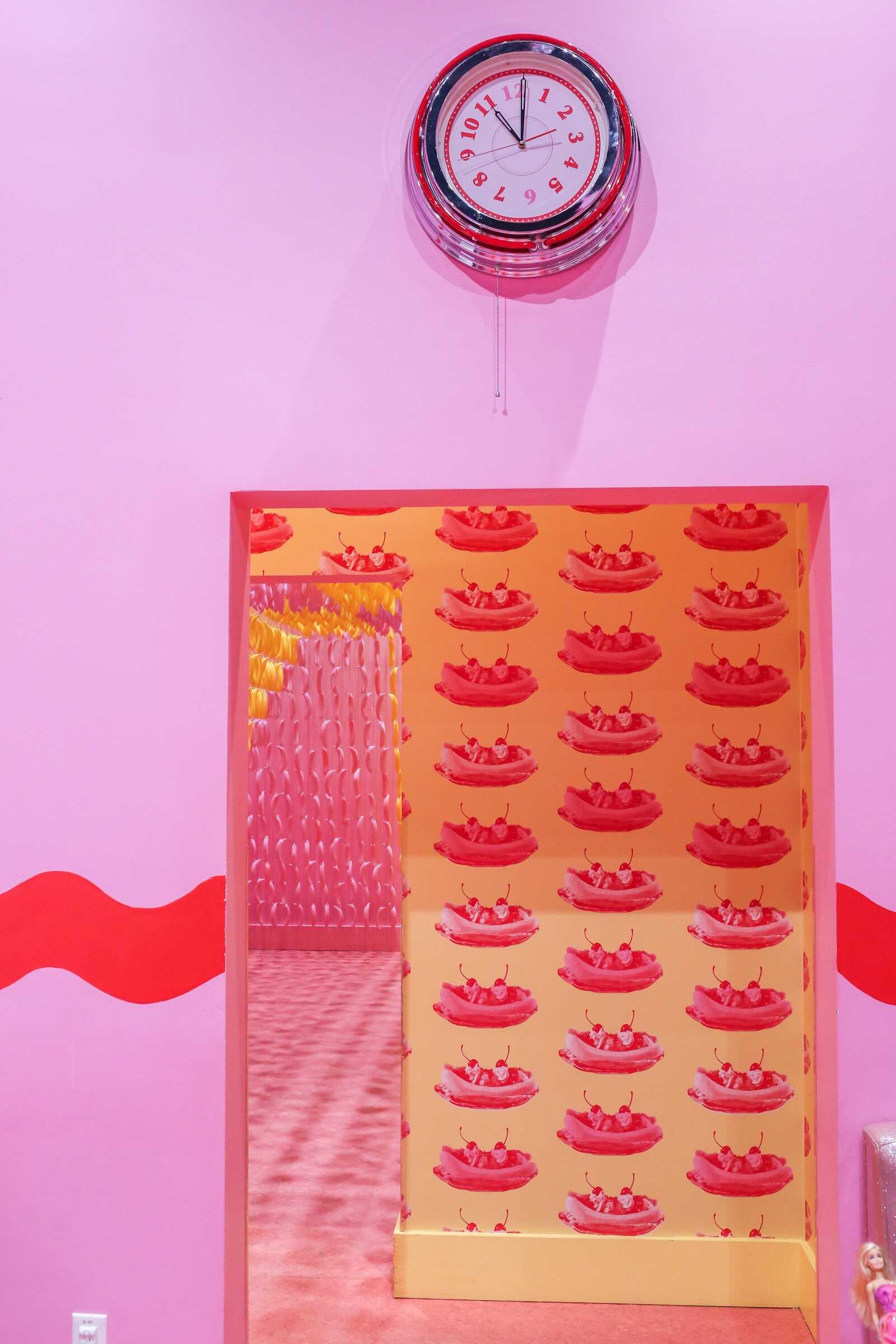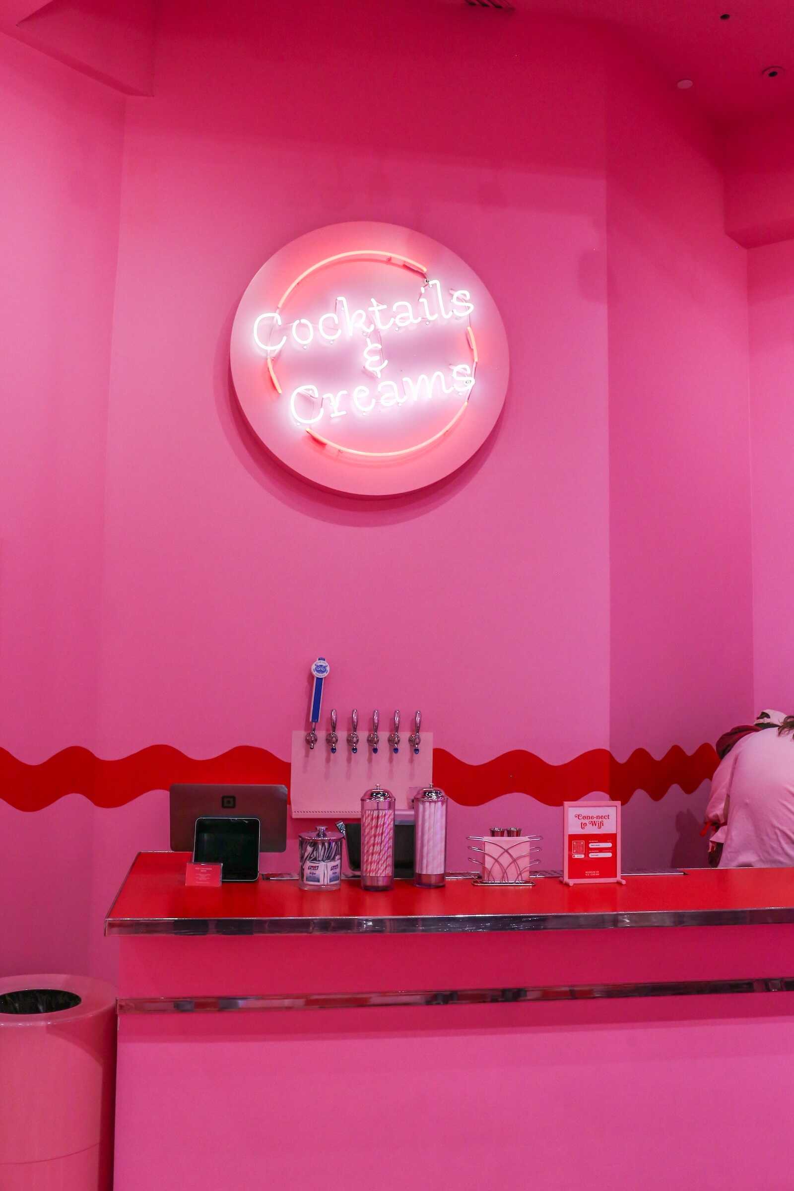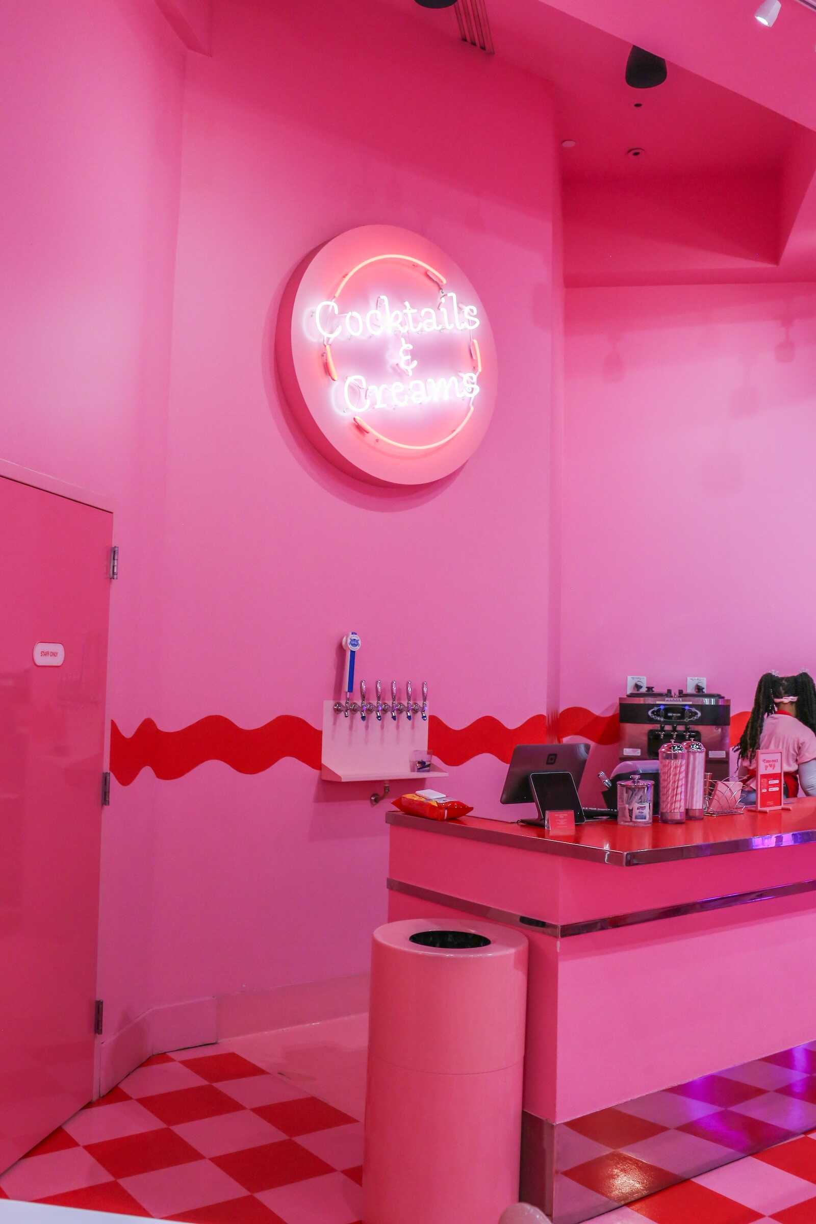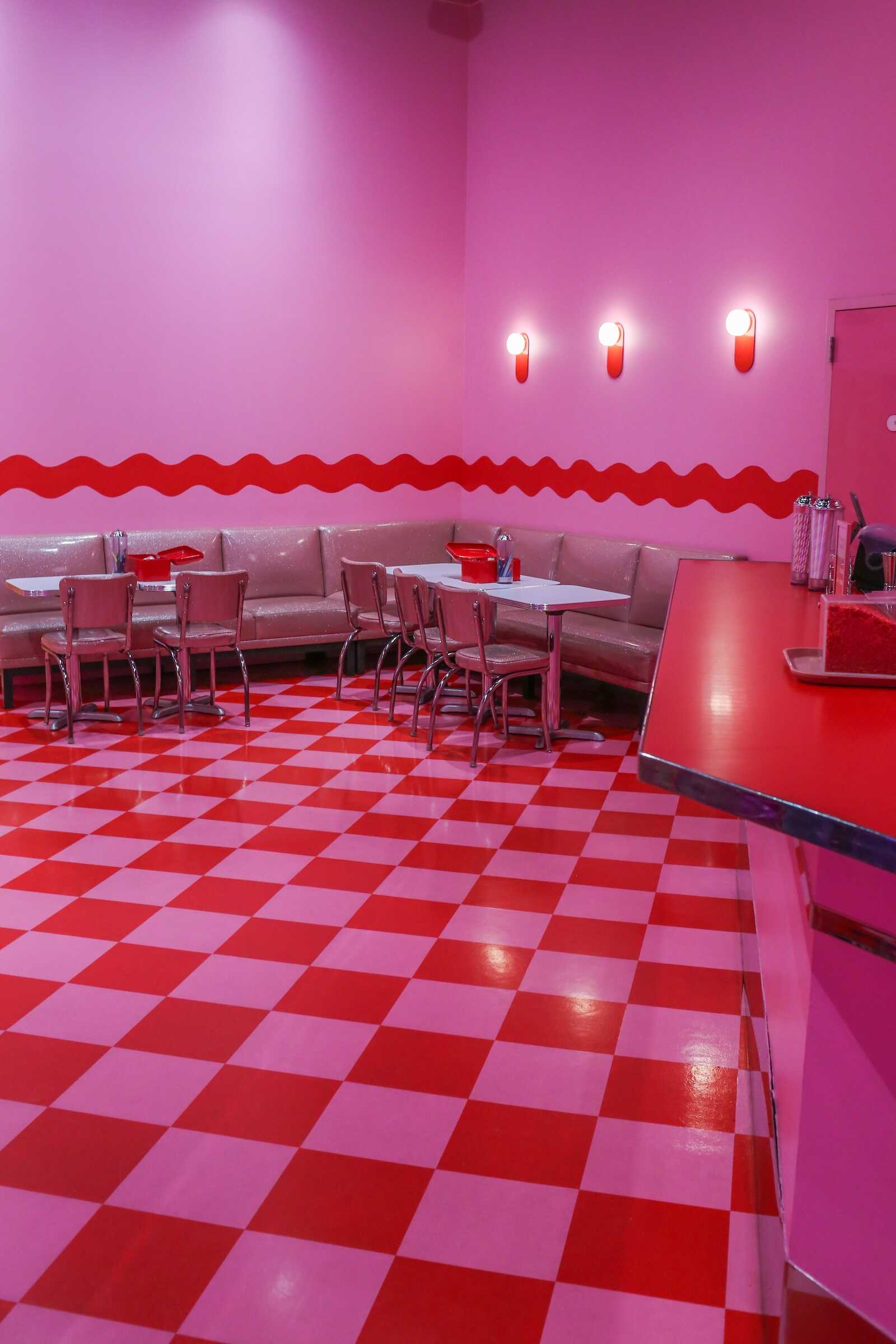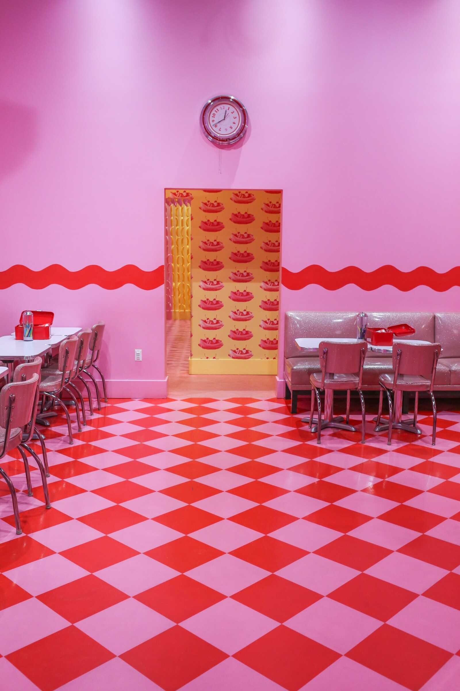 The Diner Room inside the Museum of Ice Cream Austin is a nostalgic, retro-inspired space that transports visitors back to a classic American ice cream parlor. Designed with vintage diner aesthetics, the room features bright pink booths, checkerboard floors, and neon signage, creating a fun and photogenic atmosphere.