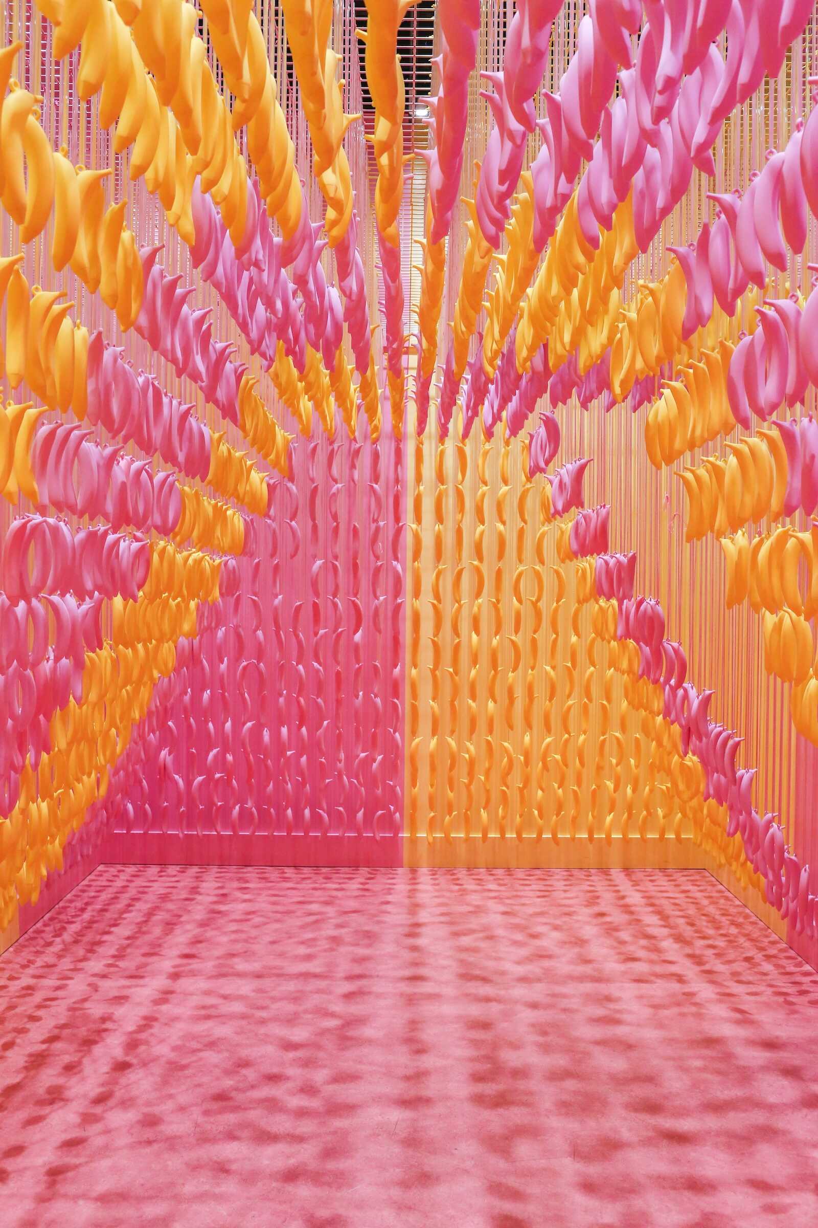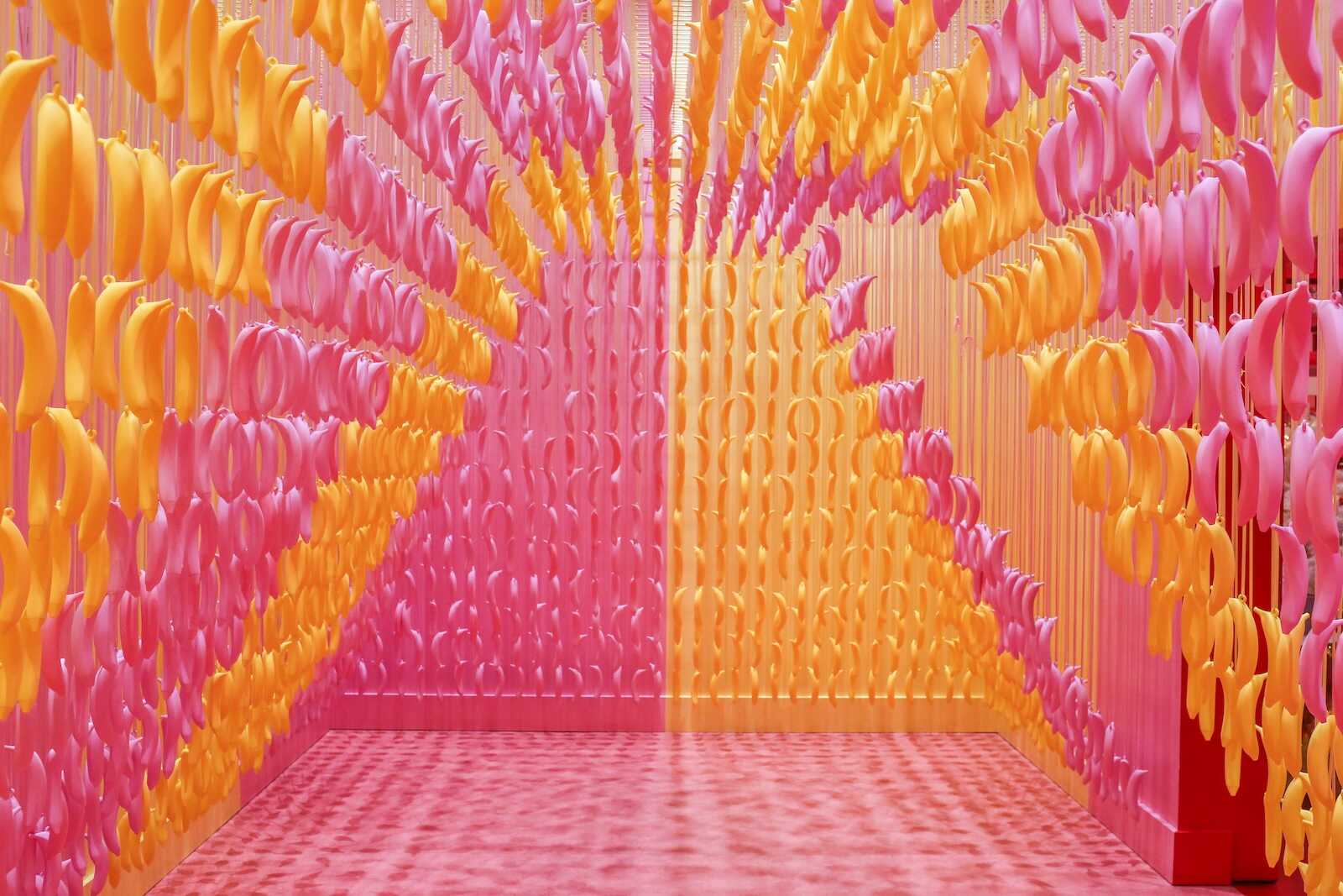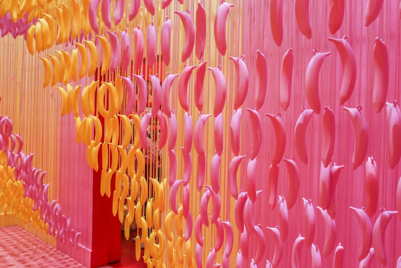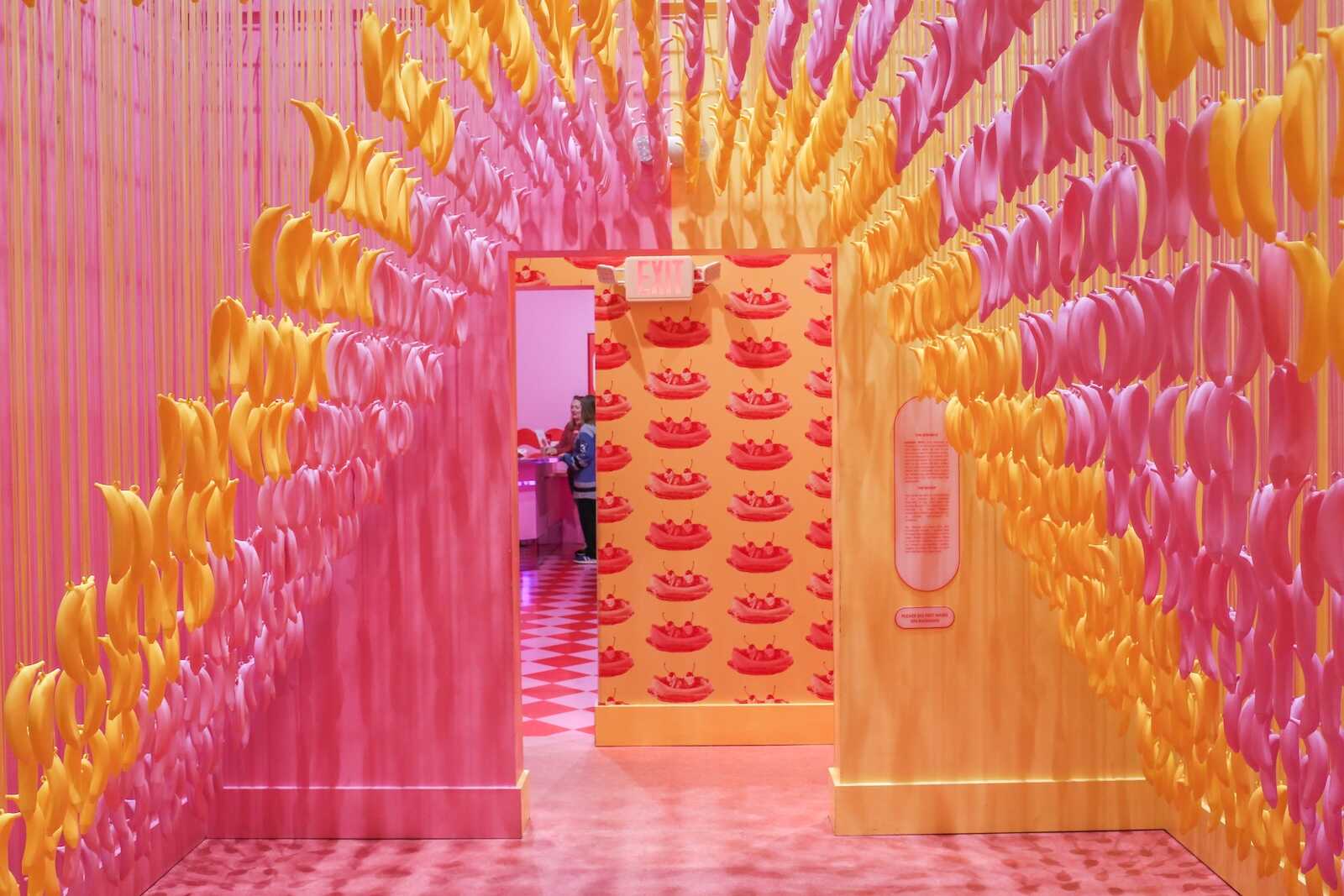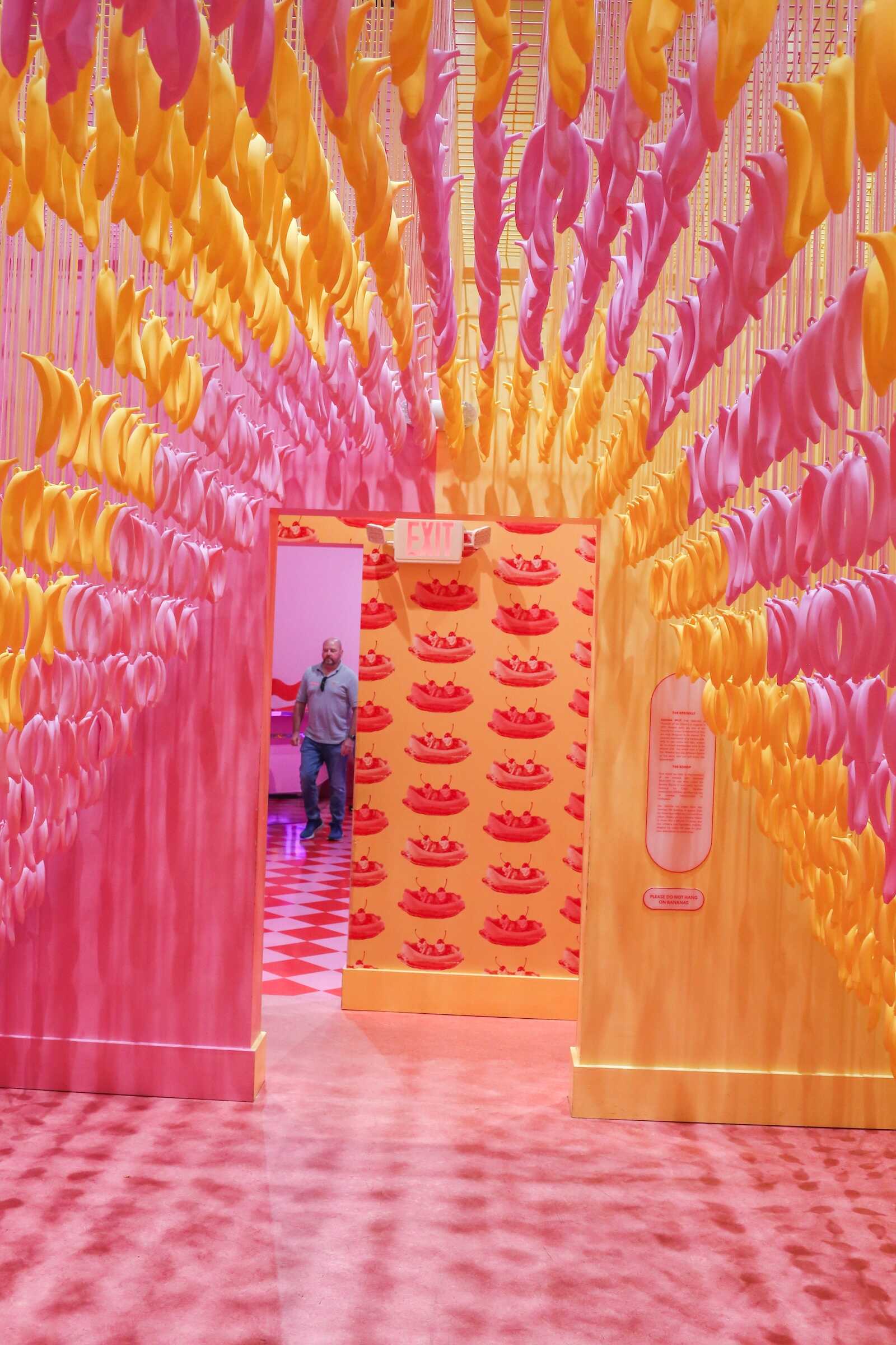 The Banana Room inside the Museum of Ice Cream Austin is a tropical, fun-filled space bursting with bright yellow hues and playful energy. As you step inside, you’re surrounded by hanging banana decorations, vibrant walls and a swing that make it feel like a whimsical jungle of fruit. One way to describe this room is that it feels very inspired by retro artist Andy Warhol.