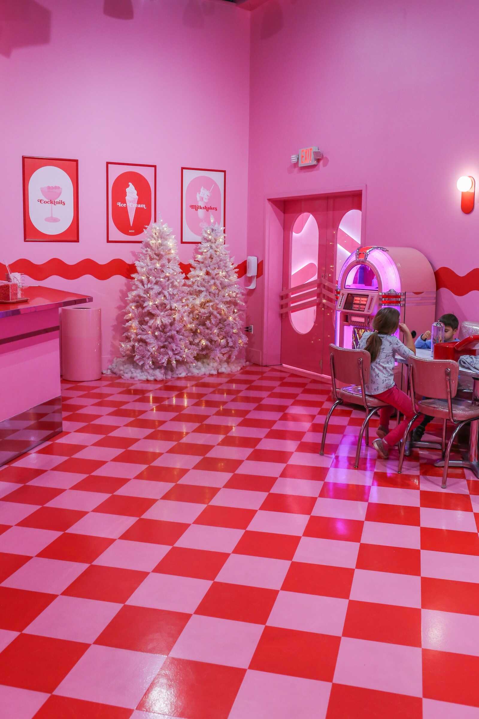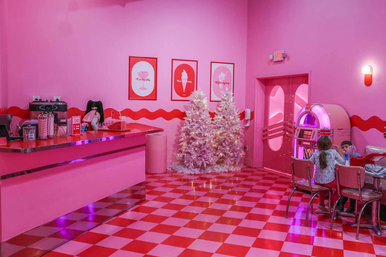 Guests can sit at the booths, spin on barstools, and enjoy sweet treats while soaking in the playful 1950s-inspired vibes. The space is interactive, encouraging visitors to engage with the decor while snapping Instagram-worthy photos. There’s paper activity sheets and coloring at the tables for kids, and you can select songs from the juke box at no extra cost.