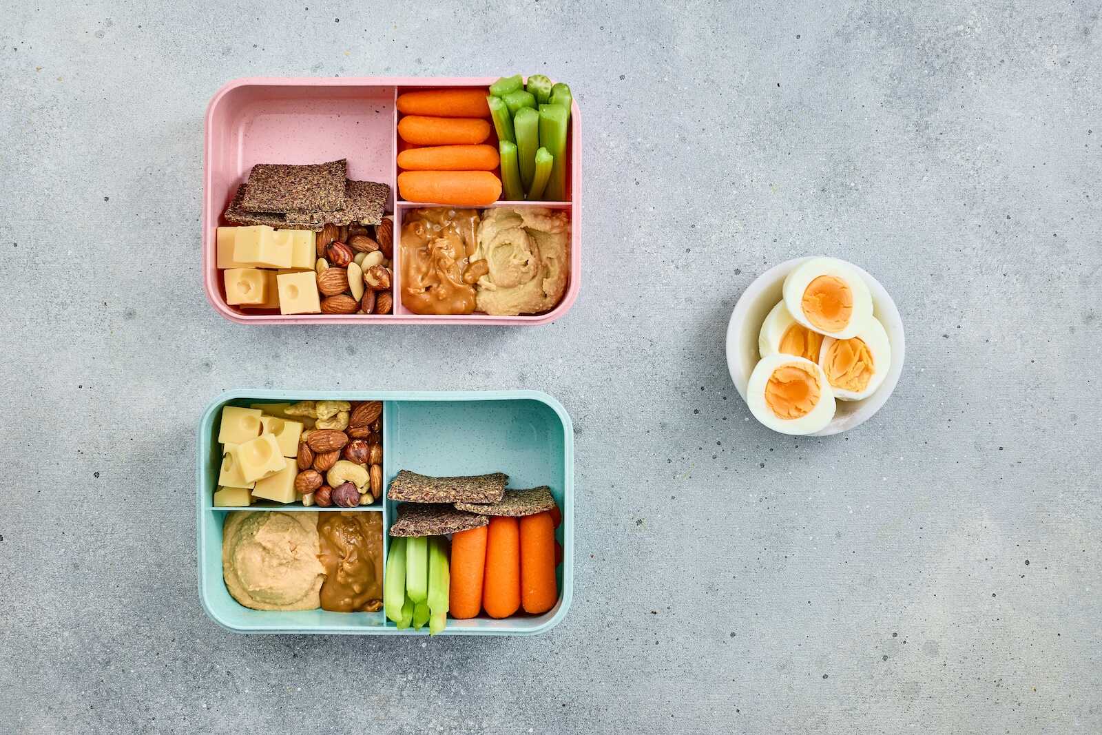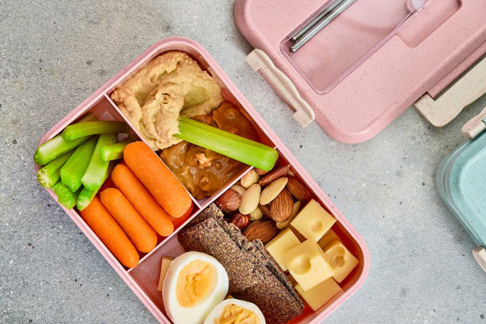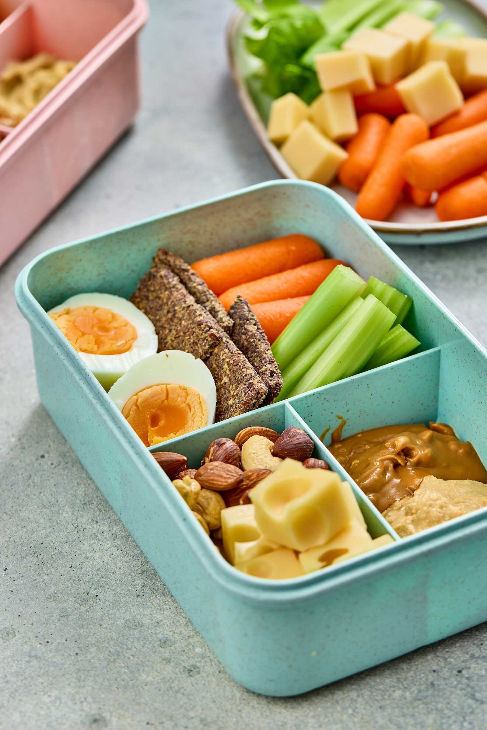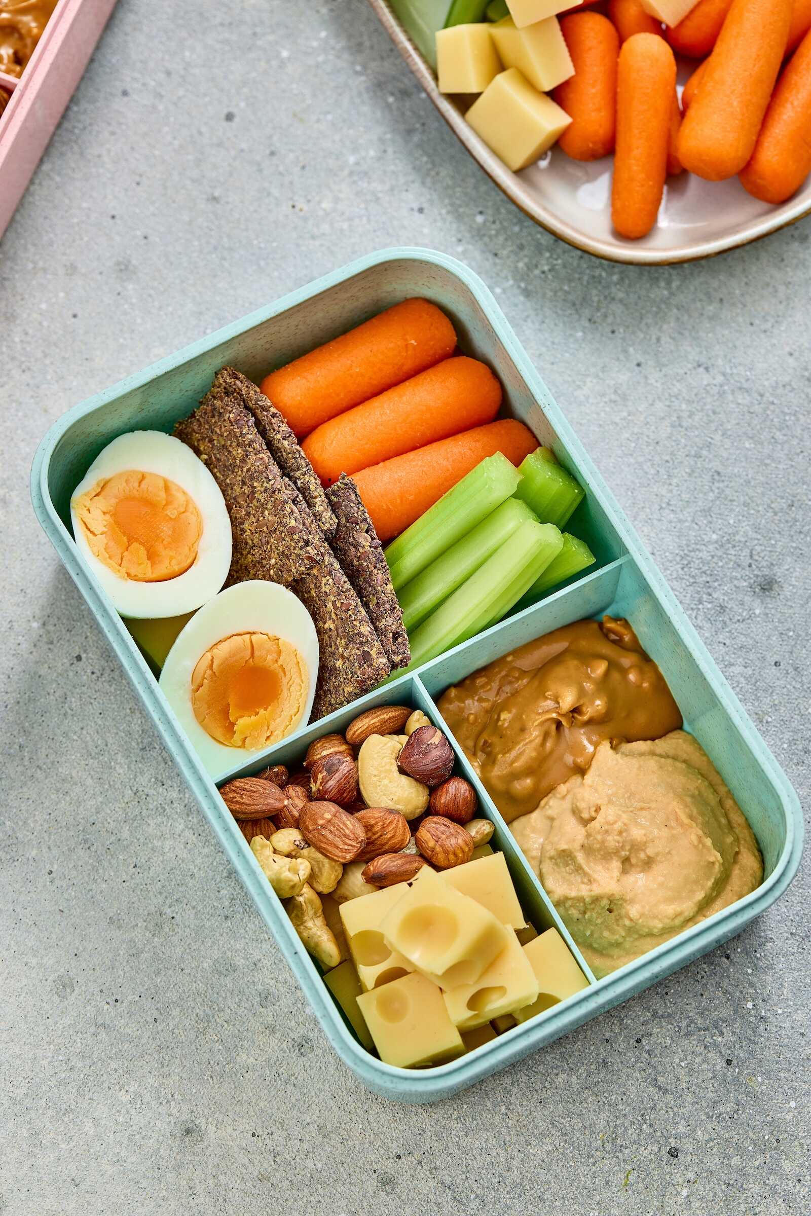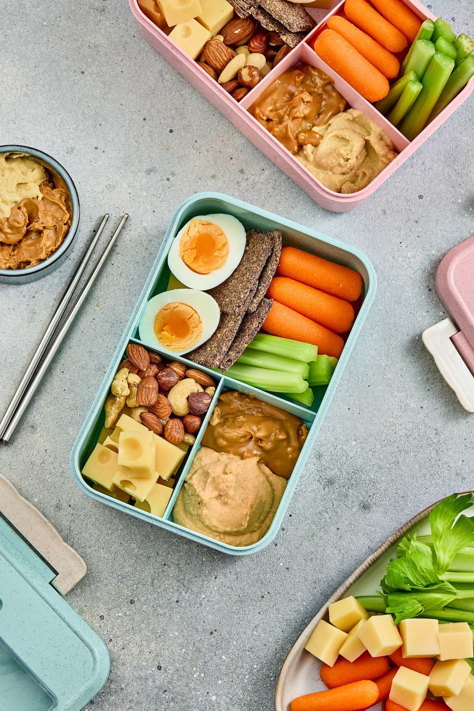 Place celery and baby carrot pieces in a small section, ideally next to the hummus or nut butter so they’re easy to grab and dip.